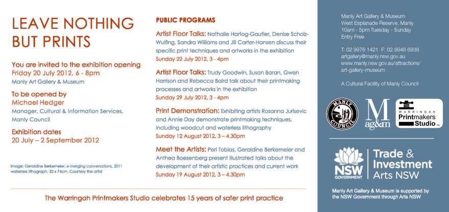 Warringah Printmakers Studio offers classes, workshops and access to artists wanting to explore printmaking in an environment which promotes safer procedures and practices. I have been a member and occasional office bearer for around 20 years. We are now celebrating 15 years since our incorporation with an exhibition at Manly Art Gallery opening on Friday, 20th July. All the works in the show have been made using safer practices.