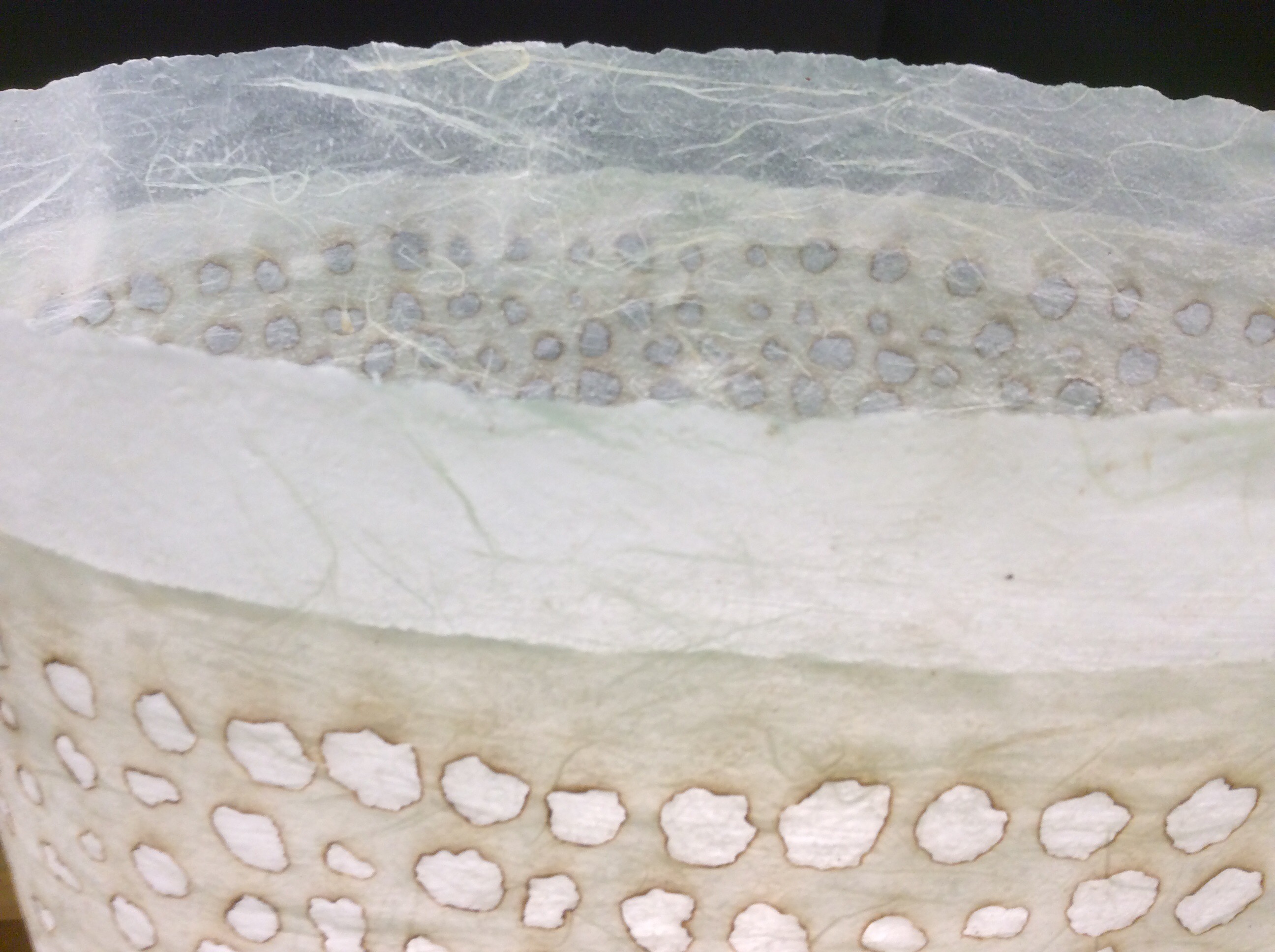 I do love the way light penetrates waxed paper. This is destined to be a lamp, and I’m working to make it completely stable and workable. I burned thousands of holes into the paper over some days. It was quite a meditative process.